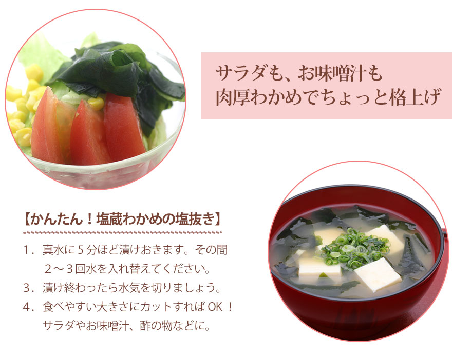 食べるときに水で塩抜きするだけで、美味しいわかめを簡単にお召し上がりいただけます。