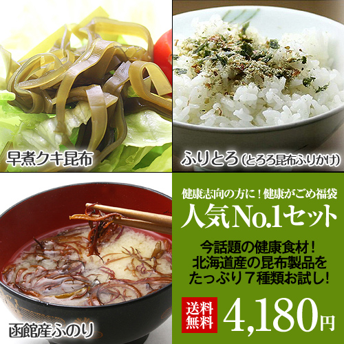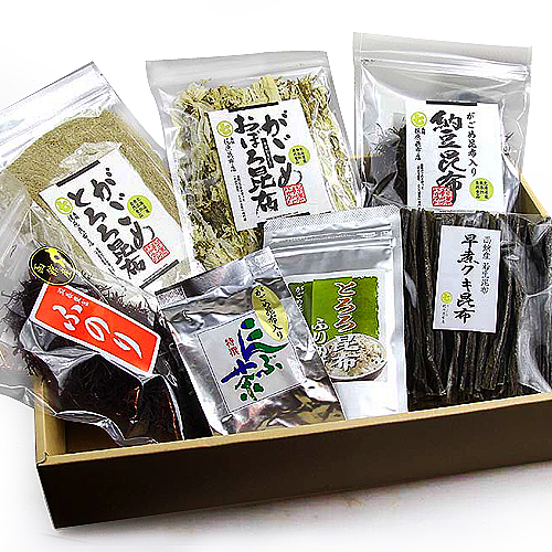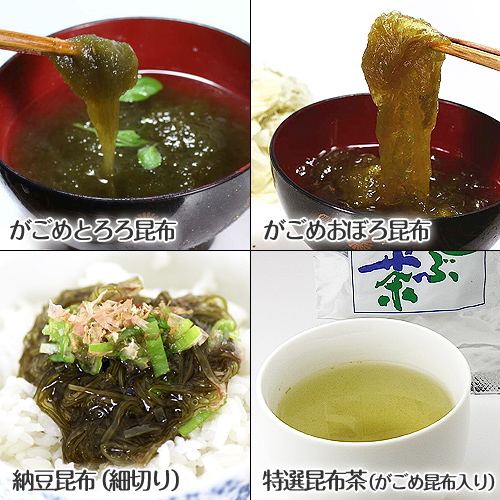 ・特撰昆布茶(がごめ昆布入り)【70g】 ・がごめとろろ昆布ふりかけ【18g】 ・早煮クキ昆布【150g】 ・ふのり(函館産)【25g】