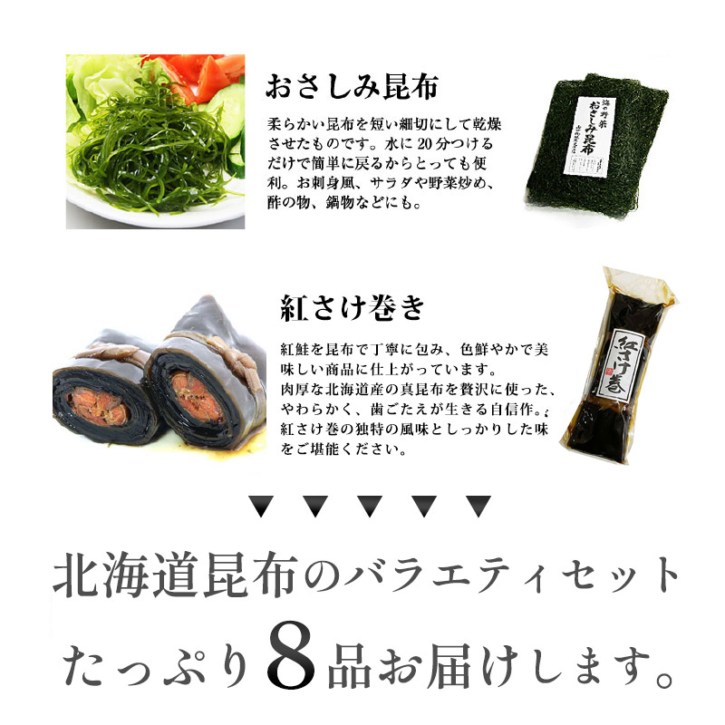 北海道産だし用真昆布(白口浜) 、がごめとろろ昆布、細切り塩昆布 函館汐花、おさしみ昆布、紅さけ昆布巻、